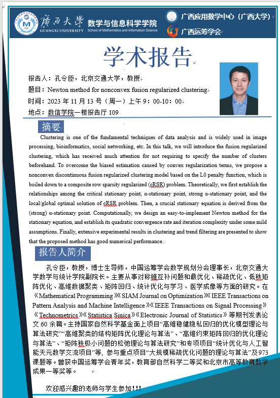 学术报告:Newton method for nonconvex fusion regularized clustering