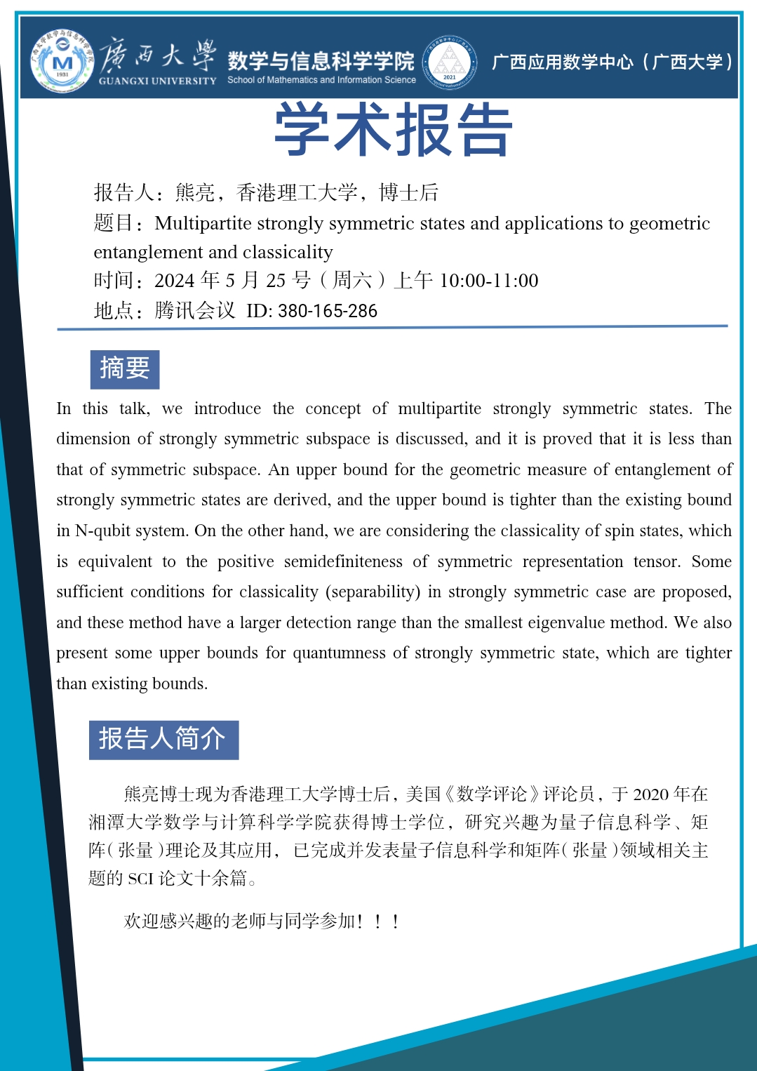 学术报告:Multipartite strongly symmetric states and applications to geometric entanglement and classicality