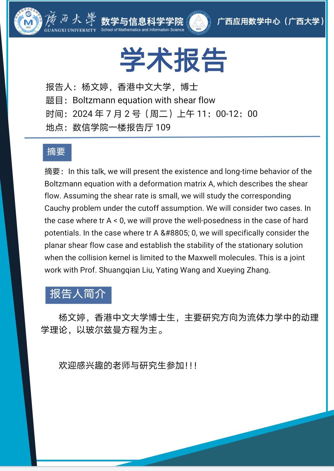 学术报告:Boltzmann equation with shear flow
