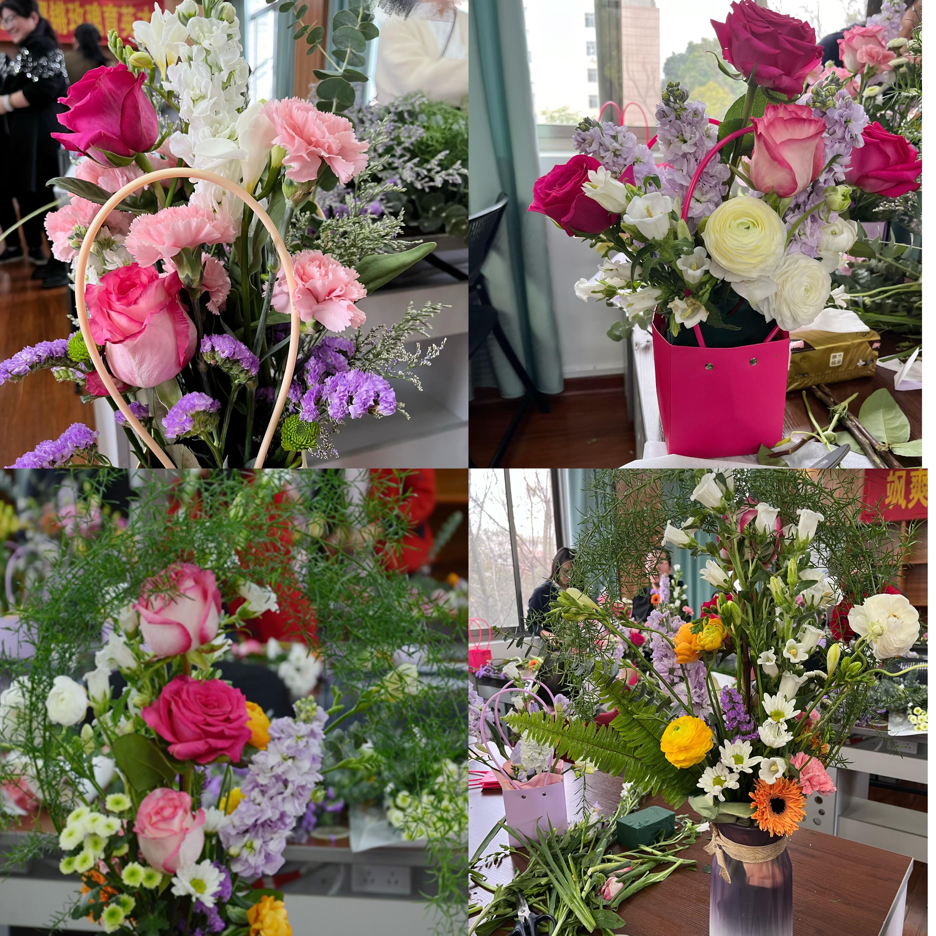 李林教授在花艺基础知识讲座中,从花材种类、颜色搭配、造型原理、作品鉴赏以及插花创作等方面为老师们科普鲜花花语和插花技巧,并现场展示经典插花造型。女教工们在老师的悉心指导下,大胆发挥自身想象力,根据手中的花材特点、颜色,创意修剪、搭配,每个人脸上都洋溢着幸福快乐的笑容,在轻松愉快的氛围中感受插花艺术的魅力,一束束错落有致、创意十足的“私人定制”花艺作品在老师们手中被赋予了新的芬芳。