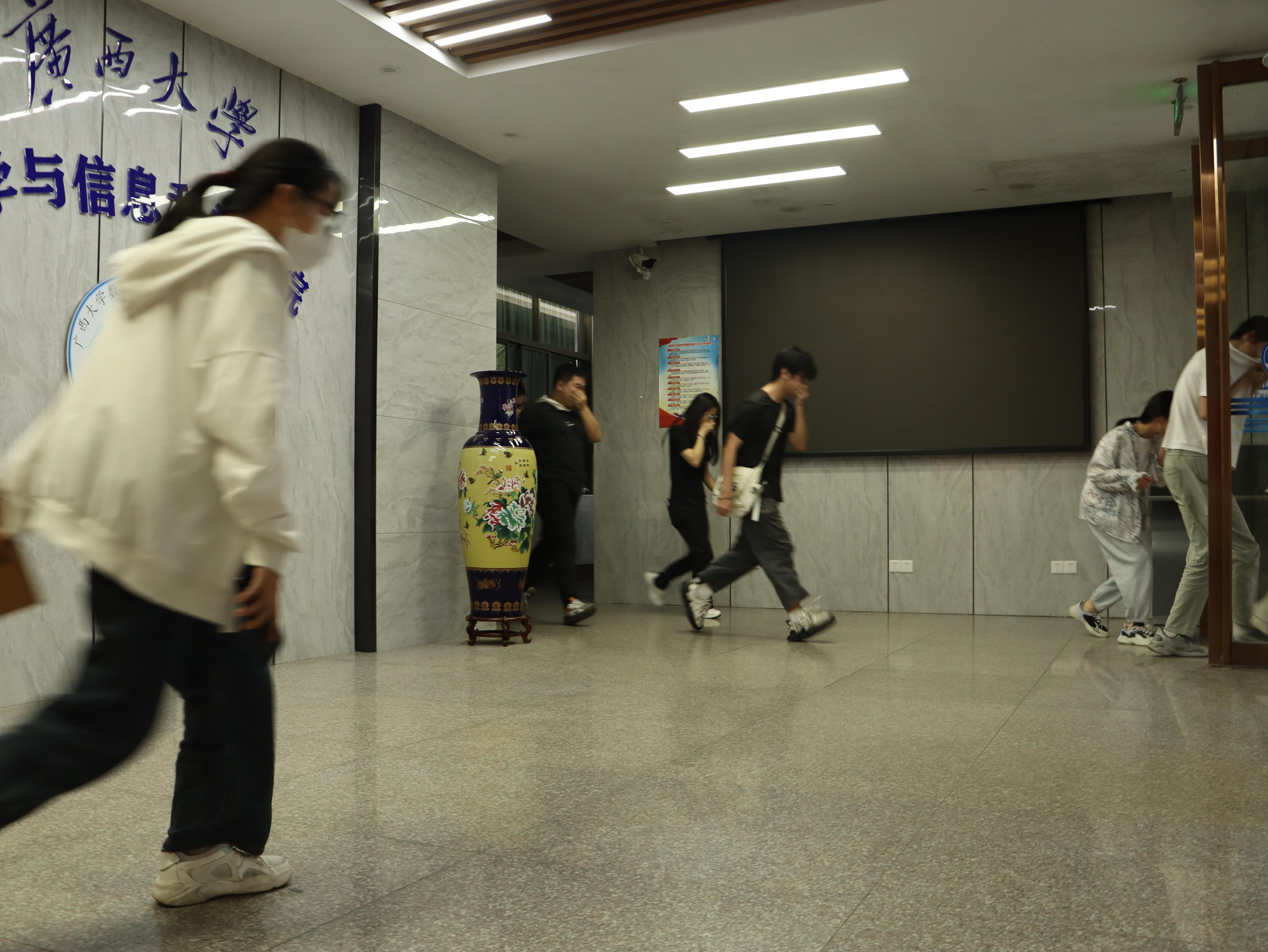 随着火灾疏散警铃的响起,疏散逃生演练拉开了序幕,各部门迅速组织师生撤离办公楼,按照火灾应急疏散预案,沿着安全出口的路线,有条不紊的进行迅速撤离,集合后,各部门负责人清点了本部人数。
