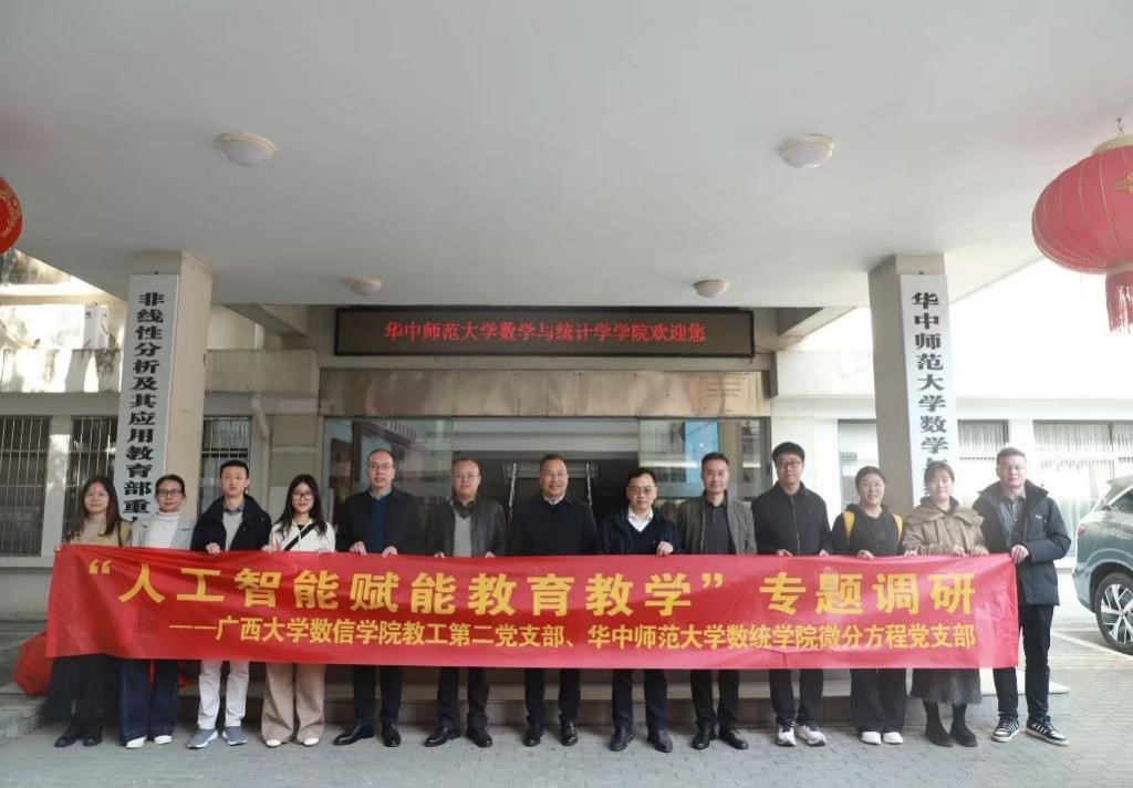 为深入学习贯彻党的二十届四中全会精神,推动党建工作与理论学习、教育服务深度融合,11月24日,在院党委副书记、院长、教工第二党支部书记郭真华带领下,我院教工第二党支部赴华中师范大学开展高校“双带头人”教师党支部“强国行”专项行动系列活动,与华中师范大学数学与统计学学院微分方程党支部开展共建联建、座谈交流、“人工智能赋能教育教学”专题调研等活动。