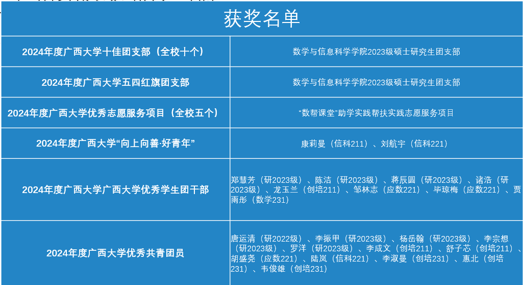五四来临之际,校团委下发了《关于表彰2024年度广西大学“十大团员标兵”“十佳团支部”的决定》《关于表彰2024年度广西大学“向上向善·好青年”的决定》《关于表彰2024年度广西大学优秀志愿服务组织、优秀志愿服务项目及优秀志愿者的决定》《关于表彰2024年度广西大学“五四红旗团委”、“五四红旗团支部”、“优秀专职团干”、“优秀学生团干部”和“优秀团员”的决定》,我院多个学生青年团组织及青年团员表现出色,获得表彰。