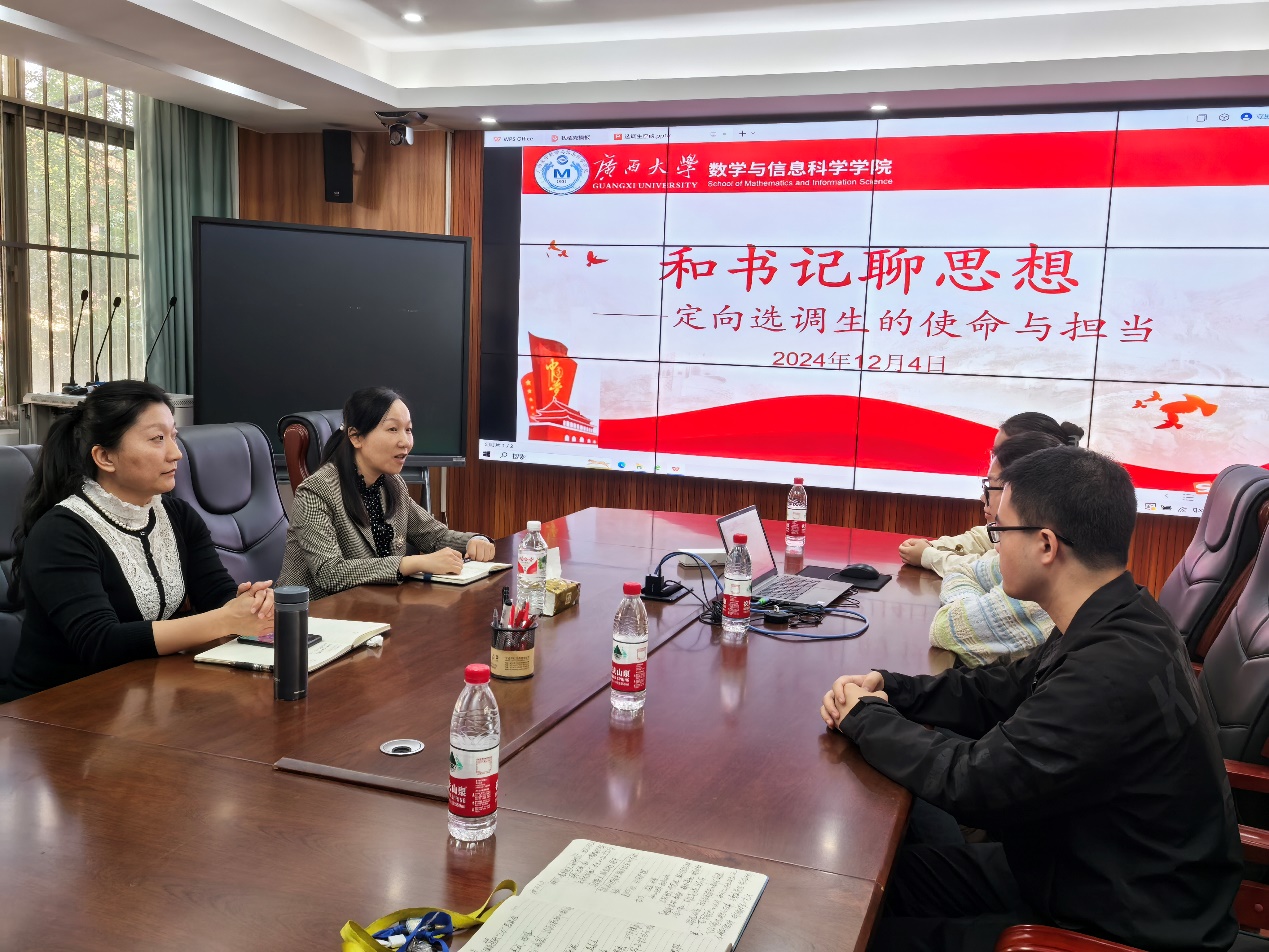 2024年12月4日,在数学与信息科学学院213会议室举行“和书记聊思想——定向选调生的使命与担当”交流会。学院党委书记吴华丽、副书记唐旭彬以及报考2025年定向广西大学选调生的全体同学参加了此次交流会。