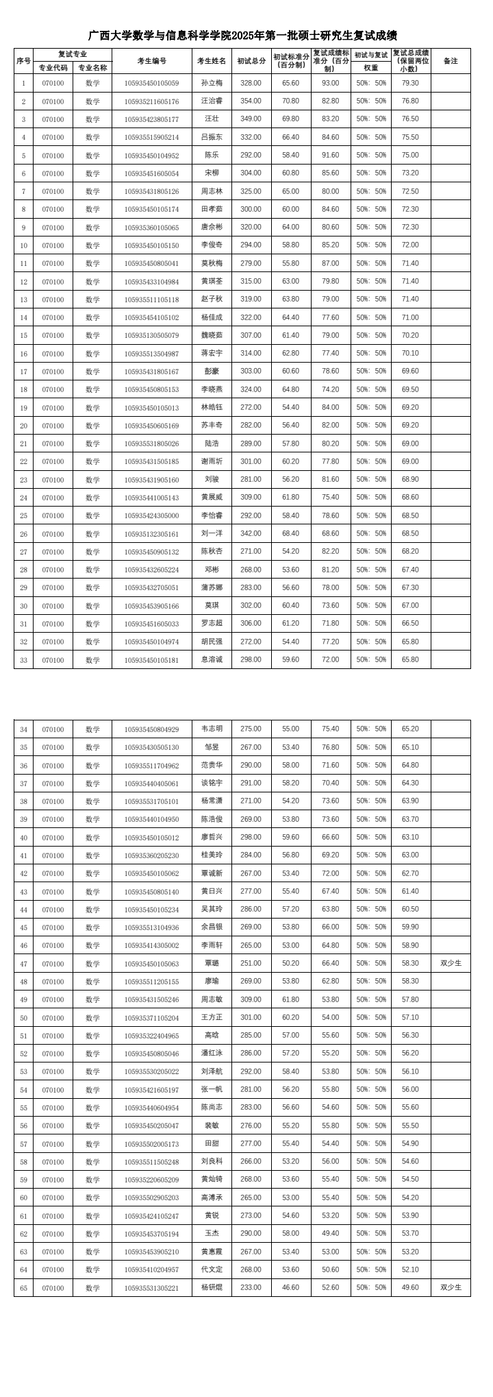 广西大学数学与信息科学学院2025年第一批硕士研究生复试成绩结果公示