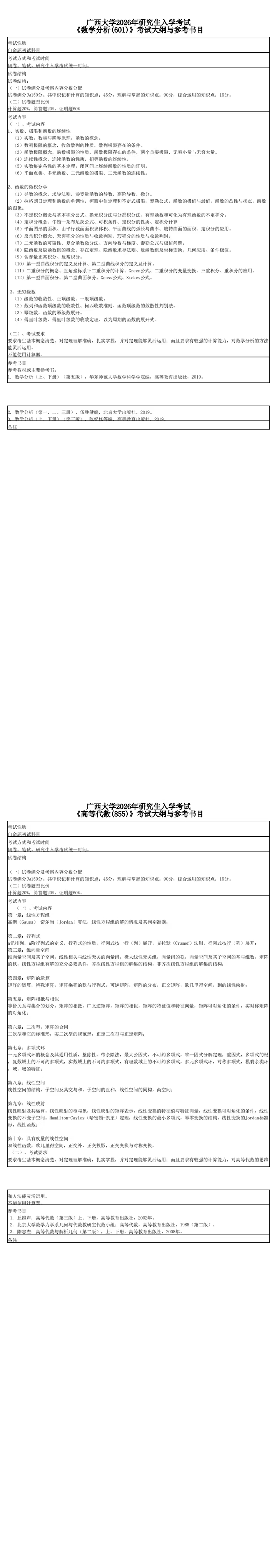 广西大学2026年研究生入学考试《数学分析(601)》《高等代数(855)》考试大纲与参考书目