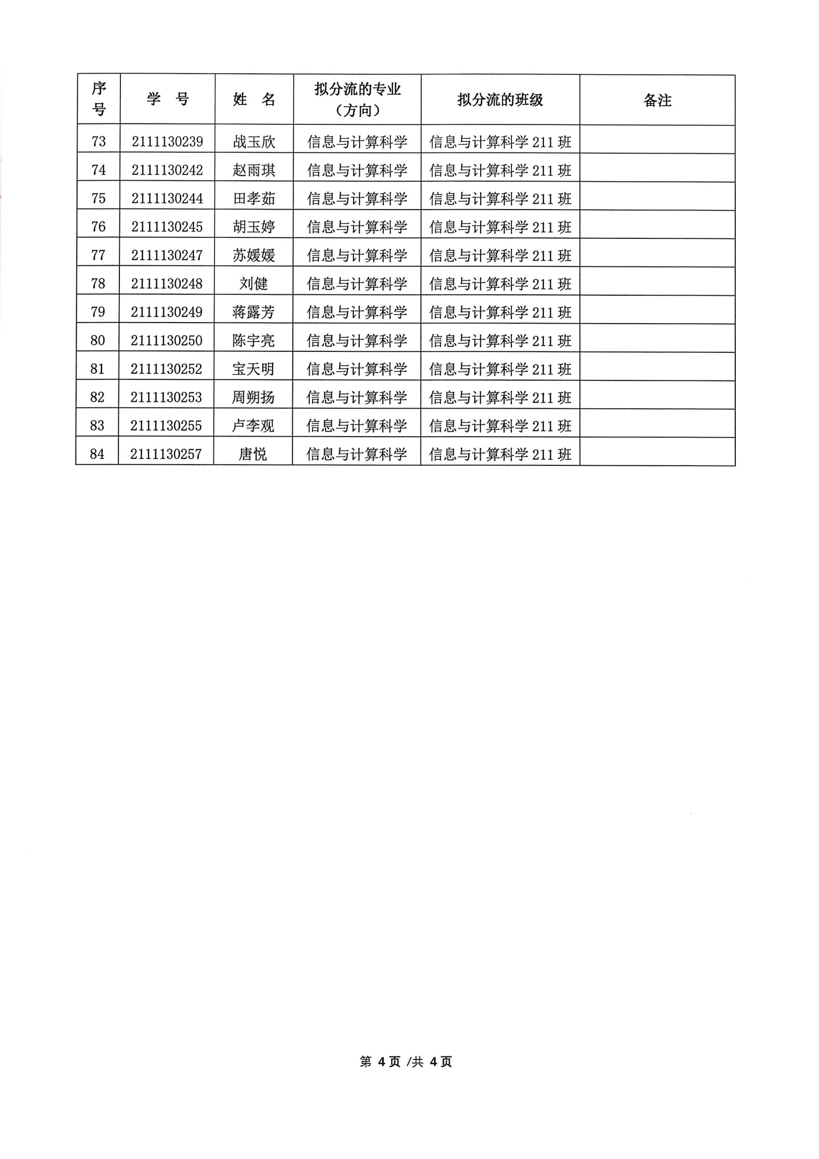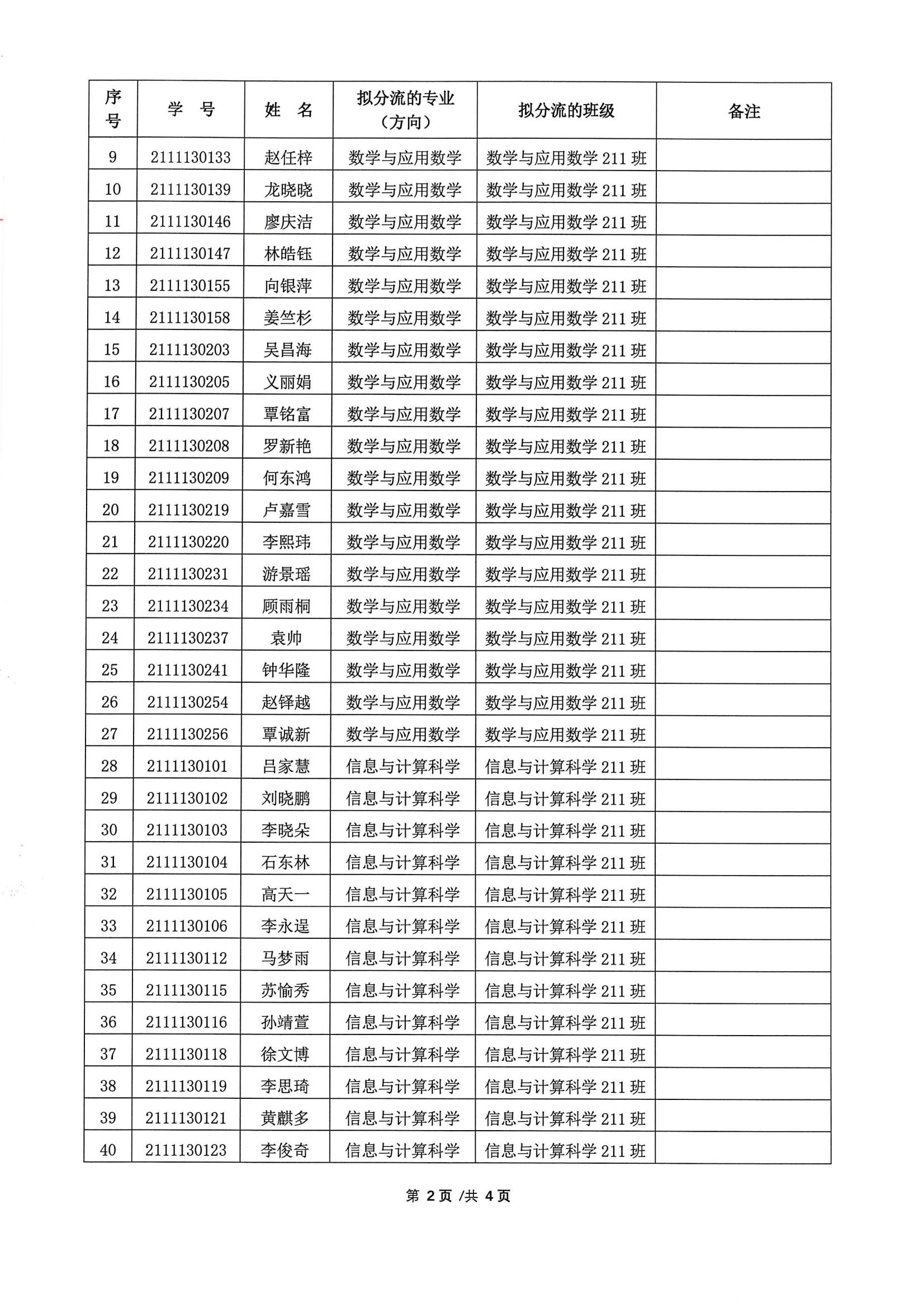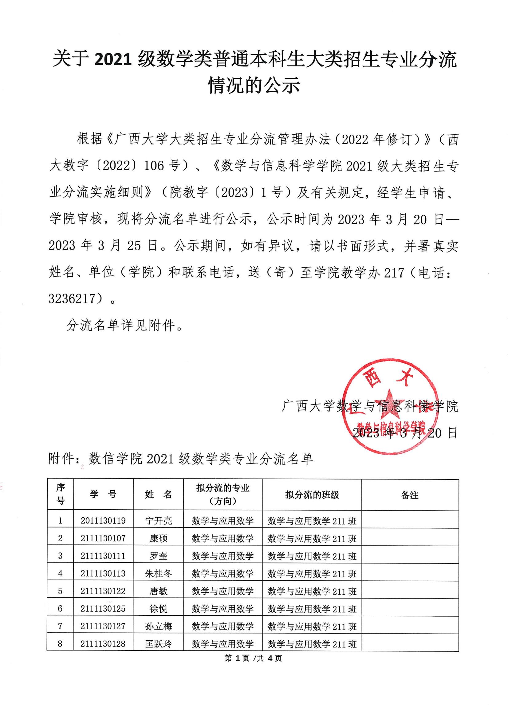关于2021 级数学类普通本科生大类招生专业分流情况的公示